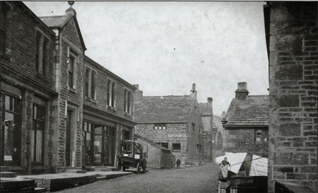 This photograph is of the town centre in the early part of the 20th century. You can see a cart (minus the horse) outside some shops, with a raised footpath.